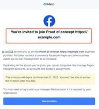 El ataque comienza cuando los ciberdelincuentes crean páginas falsas de empresas en Facebook, replicando logos y elementos visuales de Meta. Luego, utilizan la función “Invitación de Empresa” —una herramienta legítima dentro de Facebook Business Suite— para enviar correos electrónicos fraudulentos.
