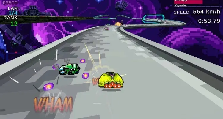 Visualmente, el juego apuesta por una estética HD-2D. Los vehículos y personajes están representados con un pixel art detallado y vibrante, mientras que los entornos mezclan fondos espaciales y texturas retro-futuristas. La fluidez es absoluta; el juego mantiene una tasa de cuadros por segundo estable incluso en las velocidades más altas, algo vital para no perder la orientación en los giros más cerrados.