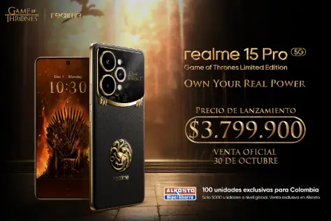 El realme 15 Pro Edición Limitada Game of Thrones ya está disponible en Colombia desde el 30 de octubre de 2025 por $3.799.900 COP, en venta exclusiva a través de Alkosto y alkosto.com.
