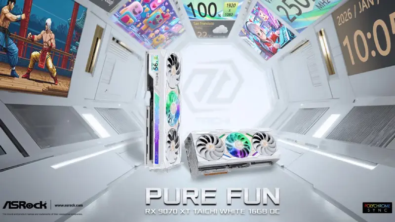 En el apartado gráfico, la estética sigue reinando. ASRock presentó su primera tarjeta gráfica blanca que incorpora una pantalla LCD: la AMD Radeon™ RX 9070 XT Taichi White 16GB OC.