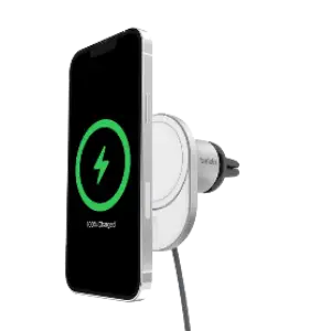 Diseñado para fijarse a la rejilla del aire acondicionado, ofrece carga rápida y segura sin cables. Es compatible con iPhone (serie 12 en adelante) y también con el nuevo Samsung S25 mediante fundas magnéticas con Qi2 o MagSafe.