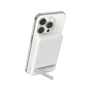 Una batería portátil compacta, con soporte integrado, capaz de ofrecer carga rápida mientras usas tu smartphone sobre la marcha.