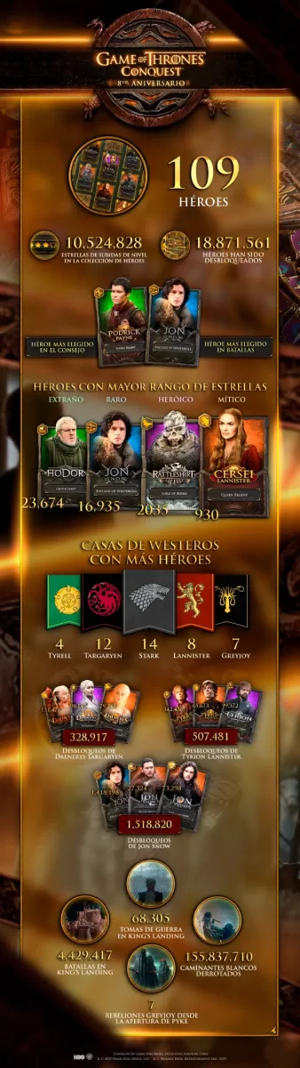 Desde su estreno en 2017, Game of Thrones: Conquest ha reunido a millones de jugadores que, inspirados por las series Game of Thrones y House of the Dragon, han forjado alianzas, librado guerras y luchado por el Trono de Hierro. El juego cuenta hoy con 109 héroes distintos de todas las eras de Poniente, cada uno con habilidades únicas que se adaptan a diferentes estilos de juego.