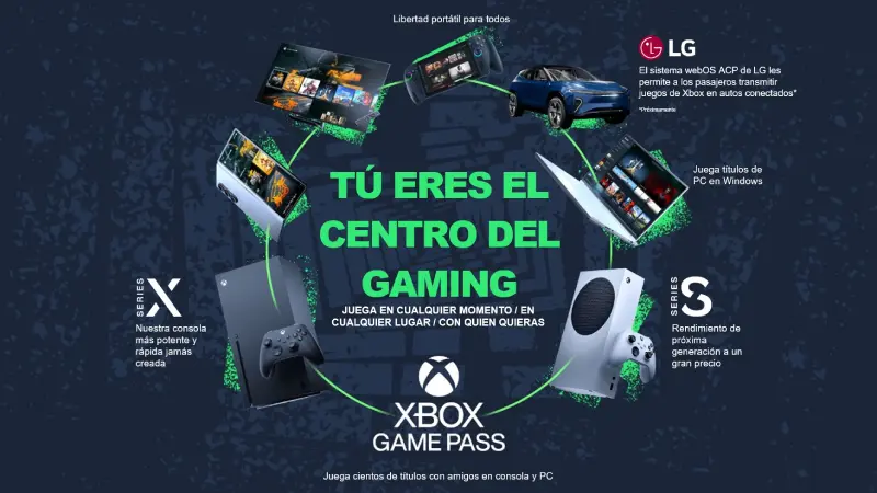 Xbox también destaca sus consolas: Series X, Series S y plataformas compatibles como LG webOS ACP —que pronto permitirá streaming directamente desde autos conectados.